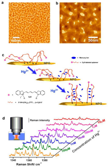 The characteristic length of the pores in the NPg film is ∼20 nm (see Figure 22a,b). The aptamer is attached on the Au ligament surface of NPG by the thiol anchor (see Figure 22c). The detection of the Hg2+ ions is obtained by monitoring the intensity changes of Cy5 Raman peaks with Hg2+ concentrations (see Figure 22d).