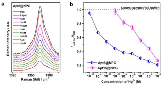 Quantitative response of the NPG sensor: (a) the main Raman peak of Cy5, at 1365 cm−1 changing the concentration of Hg2+ in the buffer solution. A significant decrease of the intensity of the peak is observed by increasing the Hg2+ concentration. (b) Plot of the normalized intensity (normalized to the intensity of the peak with PBS buffer only) of the peak at 1365 cm−1 versus the Hg2+ concentration. The comparison of the data obtained by using aptamer with 15 T (15 number of thymine bases, Apt15) and 8 T (8 number of thymine bases, Apt8) is reported. Reproduced with permission from [57]. Copyright American Chemical Society, 2013.