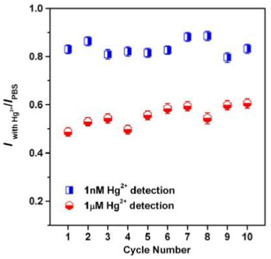 Therefore, the decrease of the Raman signals from Cy5 tags by increasing the Hg2+ concentration results in the ultra-sensitive detection of the Hg2+ ions. Figure 22d illustrates Raman spectra taken from the Apt15 functionalized NPG substrate (Apt15@NPG) with different Hg2+ concentrations. The strongest Cy5 Raman band at 1365 cm−1 was chosen for quantitative analysis based on the intensity dependence of the characteristic Raman peak on Hg2+ concentrations, as reported in Figure 23a. In addition, Figure 23b reports the plot of the normalized intensity (normalized to the intensity of the peak with PBS buffer only) of the peak at 1365 cm−1 versus the Hg2+ concentration. The comparison of the data obtained by using aptamer with 15 T (15 number of thymine bases, Apt15) and 8 T (8 number of thymine bases, Apt8) is reported. It is recognizable that the detection sensitivity of the Apt15@NPG sensor for Hg2þ is better than 1 nM with a dynamic detection range from 1 nM to 10 μM. The sensitivity of Hg2+ detection is related to the distance between Cy5-tags and the plasmonic surface of NPG. The more thymine bases are in the oligonucleotide, the more Hg2+ ions are required to form a duplex-like structure that hauls up Cy5-tags from the substrate surface for the corresponding Raman signal reduction. Therefore, the short aptamer Apt8 is expected to be more responsive to Hg2+. Furthermore, the authors, to verify the selectivity recognition of Hg2+, replaced Hg2+ by other metal ions as Pb2+, K+, Fe3+, Co2+, Mn2+, Ca2+, Ba2+, Ni2+, Cu2+, Zn2+, and Mg2+, finding that the sensor shows appreciable Raman intensity change in the response to Hg2+ with respect to the other ions. The sensor selectivity was, also, verified with respect to mixtures of Hg2+ and other cations as Pb2+, Ni2+, Fe3+, Co2+, and Mn2+ finding that these have no response to the sensor. Finally, it is important to comment on the re-usability of the sensors, as reported in Figure 24. The authors show that the NPG/aptamer optical sensor is readily regenerated in 100 mM ascorbic acid solution for 1 h, followed by washing with a 33 mM PBS buffer (pH 6.9) solution containing 0.5 M NaCl and 0.1 M NaClO4 for 15 min. Figure 24 allows to infer that the sensor practically maintains the initial sensitivity after 10 typical cycles of the regeneration for detecting 1 nM and 1 μM Hg2+ in aqueous solutions.