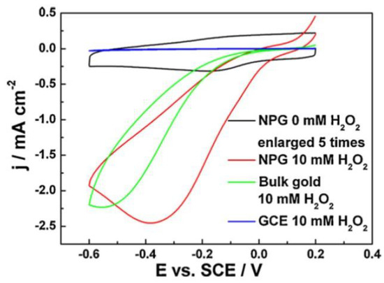 - Meng, F.; Yan, X.; Liu, J.; Gu, J.; Zou, Z. Nanoporous gold as non-enzymatic sensor for hydrogen peroxide. Electrochim. Acta 2011, 56, 4657–4662. [Google Scholar] [CrossRef]