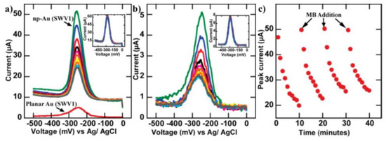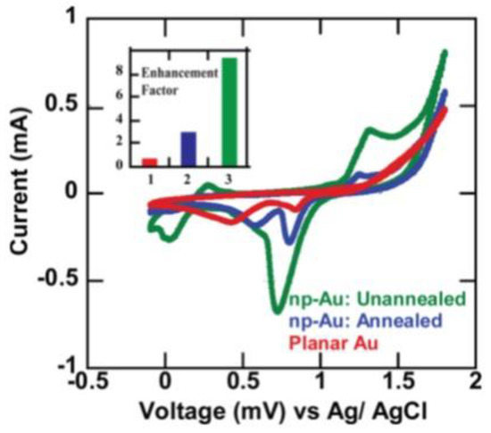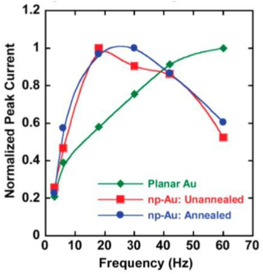 NPG-based sensors have shown exceptional sensitivity and selectivity to a wide range of analytes ranging from molecules to biomolecules (and until the single molecule detection) and the enormous surface/volume ratio was shown to be crucial in determining these performances. In this regard, recently, a further development was identified in the use of nanoporous Au nanostructures (as nanoparticles and nanowires [92,93,94,95,96,97,98,99,100,101,102,103]), in addition to nanoporous Au films and leafs, due to the additional increase of the exposed surface area reaching, also, the value of 105 g/m2 [97] resulting in the possible further sensitivity increase.