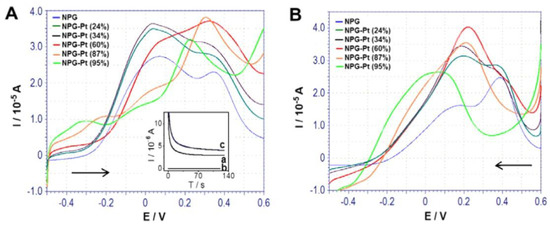 - Ge, X.; Wang, R.; Liu, P.; Ding, Y. Platinum-decorated nanoporous gold leafs for methanol electrooxidation. Chem. Mater. 2007, 19, 5827–5829. [Google Scholar] [CrossRef]