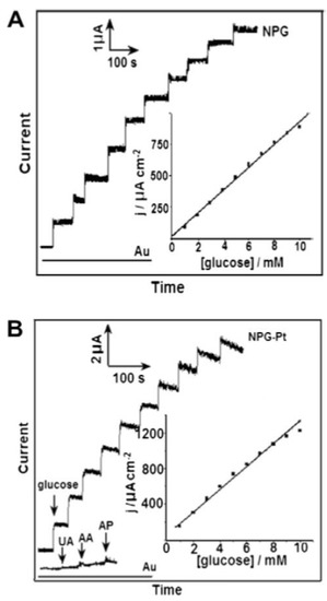 - Qiu, H.; Huang, X. Effects of Pt decoration on the electrocatalytic activity of nanoporous gold electrode toward glucose and its potential application for constructing a nonenzymatic glucose sensor. J. Electroanal. Chem. 2010, 643, 39–45. [Google Scholar] [CrossRef]