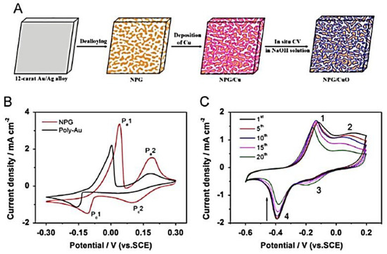 NPG is a three-dimensional nanostructured bulk material. It is typically generated from an alloy of gold (Au) and a less noble metal, such as for example Silver (Ag) or Copper (Cu). With the chemical or electrochemical removal (through a “dealloying” approach) of the less noble component, the remaining Au undergoes a “self-organization” process forming a porous and continuous three-dimensional network of interconnected ligaments with peculiar optical, electrical, mechanical, reactivity properties [20,21,22,23,24,25,26,27,28,29,30,31,32,33,34,35,36,37,38,39,40,41,42,43,44,45,46].
