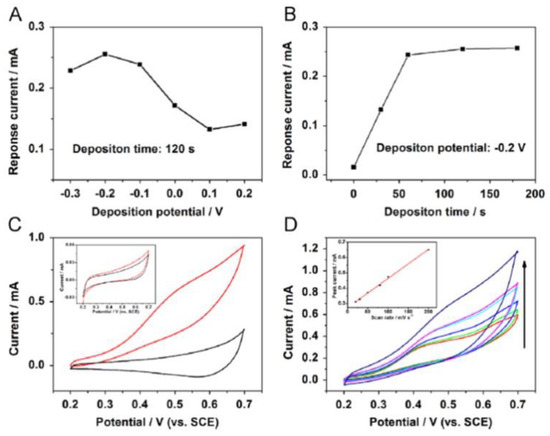 The fabrication of sensing devices based on metal nanostructures has received a great attention by the scientific community in the last years due to their unprecedented performances, in terms of sensitivity, limit of detection, selectivity, chemical and structural flexibility [1,2,3,4]. In this framework, Au and Ag nanostructures and nanostructured materials represent key elements in order to produce innovative cutting-edge sensors finding applications in any technological field. This characteristic relies in some peculiar properties as enormous surface area, plasmonic behavior, and biocompatibility [1,2,3,4]. The successful development of nanomaterials is strictly related to the capability in fabricating shape-, size-, and structure-designed nanostructures [5]. These nanomaterials can be, then, integrated into the final functional devices. However, to be industrially attractive, the nanofabrication processes need to be simple, versatile, cost-effective, with high throughput and should allow the easy control of the nanomaterial’s morphology and structure. In fact, referring, in particular, to the sensing applications, complex-morphology metal nanostrucutres are highly desirable in order to enhance their exposed surface area and plasmonic response (in which the enhancement of the incident electromagnetic radiation by the so-called hot-spot effect which is of paramount importance in Surface Enhanced Raman Spectroscopy, SERS) [1,2,3,4,5,6,7,8,9,10,11,12,13]. Plasmonic effects in metal nanostructures [14,15,16], for example, greatly renewed the interest in the use of these systems: the collective oscillation of electrons in a metal nanostructure resonates with particular wavelengths of light, generating the localized surface plasmon resonance (LSPR). The LSPR results in absorption and scattering of incoming photons. Absorption leads to photothermal generation of heat, photoluminescence, and quenching of fluorophores in close proximity. Scattering results in reflected photons and its amplification of the local electromagnetic field can enhance fluorescence, phosphorescence, and Raman scattering. These optical properties make plasmonic nanostructures ideal candidates for sensing, biomedical, drug delivery applications [4]. Plasmonic nanostructures are particularly suitable for Raman-based sensing because of the massive enhancement factor that can be achieved with precisely shaped particles. When a Raman-active dye is adsorbed to the surface of the plasmonic nanomaterials, fluorescence is quenched, minimizing its competing signal. Raman-based detection can be performed with label-free assays or Raman reporters. Label-free detection is often utilized for the detection of small molecules [4]. In addition, regarding sensing applications, the catalytic ability of metal nanomaterials has proven to be very powerful in the electrochemical detection of analytes [1,2,3,4]. Electrochemical sensors are based on the electrical signal produced by a specific analyte [17,18,19]. The increased catalytic activity of nanomaterials in comparison to the corresponding bulk materials is due to the highly curved morphology of the nanoscale material, determining a high density of steps, holes, and kinks [17,18,19,20]. These areas are host to low coordination atoms, in contrast to the normal high coordination associated with a close-packed surface. These low coordination sites interact more strongly with target molecules and these molecues, also in a very low amount, once adsorbed on the nanomaterial surface, determine a significant change in the electrical properties of the system.