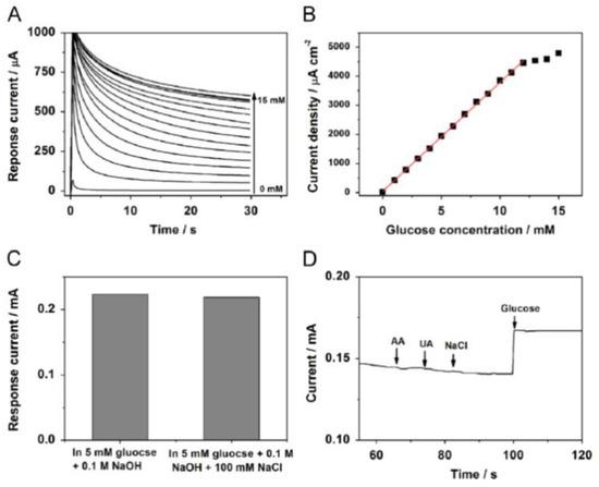 - Guo, M.-M.; Wang, P.-S.; Zhou, C.-H.; Xia, Y.; Huang, W.; Li, Z. An ultrasensitive non-enzymatic amperometric glucose sensor based on a Cu-coated nanoporous gold film involving co-mediating. Sens. Actuators B 2014, 203, 388–395. [Google Scholar] [CrossRef]