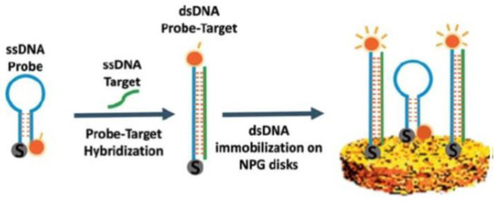 The sensitivity to Hg2+ of the NPG/aptamer sensor is based on the changes of the Cy5 Raman intensity determined by the cooperative coordination of a pair of poly-T oligonucleotides with Hg2+ ions as shown in Figure 22c. In the absence of Hg2+, the single strand poly-T oligonucleotides display a flexible and random structure. Most Cy5 tags lay on the NPG surface and the Raman signals of Cy5-tags can be maximally enhanced by the local surface plasmon resonance originating from NPG. The T-Hg2+-T coordination complex may not be the exact antiparallel or parallel duplex. As a result, the Cy5 tags are pulled away from the NPG substrate, resulting in a decrease in the Raman signals of the Cy5 tags.