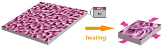 There have been, also, several efforts in controlling the morphology of NPG, for example by inducing coarsening of the ligaments (ligament size refers to the dimensions of the regions that surround the pores on the surface of the structure) and the pores either by thermal treatments. Thermal annealing studies have been performed on NPG leafs and films to study the porosity changes as well as the pore size distribution across the sample. As an example, Chen et al. [33], after producing NPG films, studied the effect of post-annealing atmosphere on the evolution of the porous morphology. In particular, the authors used Au35Ag65 (at.%) films with a thickness of 100 nm to produce NPG through chemical dealloying in 65% (wt.%) HNO3 and then these samples were annealed for two hours in the temperature range 100–600 °C under the atmospheres of oxidative air (O2), inert Ar and reductive CO gas (5% CO + 95% Ar), respectively. As an example, Figure 7 reports some representative scanning electron microscopy images of the surface of the NPG films after annealing at different temperatures and under the different atmospheres. Figure 8 reports, hence, the mean ligaments and pores size as a function of the annealing temperature under the different annealing atmospheres: both the pores and Au ligaments grow exponentially as a function of annealing temperature. However, the annealing atmosphere significantly influences the growth of the ligaments and pores: generally, the authors find that NPG films posses the higher stability in the reductive atmosphere (CO) and the lower stability in oxidative air. In particular, the NPG films thermally processed in air show a significant pores growth at 200 °C while at 300 °C the porous morphology is lost; in air, in fact, the surface oxidation limits the diffusion of the oxygen into the interior of the NPG, however the thermal-induced coarsening of NPG films in air is due to the desorption of O2 from the NPG surface above 200 °C and at 300 °C the NPG film collapses. In this condition, the three-dimensional porous structure disappears and an apparent ligament fusion is observed above 300 °C, as indicated by arrows in Figure 7b,c. The NPG films processed in CO environment maintain the porous structure until 600 °C. With respect to the annealing in air, the annealing of the NPG films in CO gas leads to the stabilization of the porous structure by strong bindings of the CO molecules to the Au atoms resulting in an adsorption layer on the Au surface inhibiting the Au atoms surface diffusion. So, also by post-dealloying thermal processes, the kinetic evolution of the NPG is established by the Au atoms diffusion behaviour.