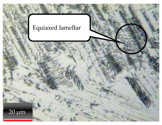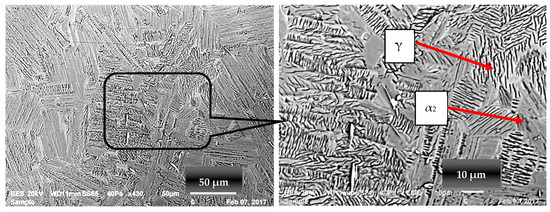 Through the analyses of the composition using the binary phase diagram, the typical microstructure of this composite can be considered as a mixed-phase “γ-TiAl and α2-Ti3Al”. Finally, the major microstructure is a substantially equiaxed lamellar structure made up of lamellar platelets containing platelets of the γ phase of the structure of the face-centred cubic lattice (fcc) (111) type L10 and a very fine α2-(0001) hexagonal structure (Figure 3).