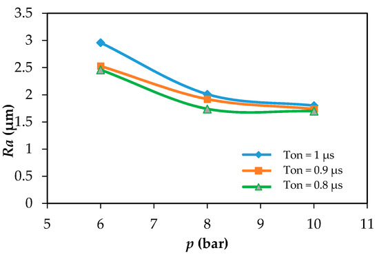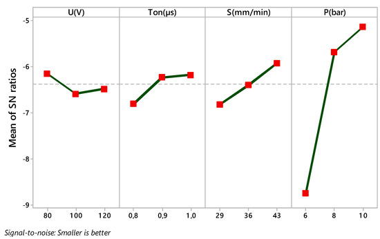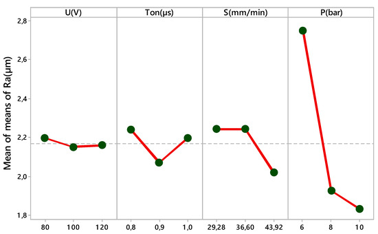 Figure 15 displays the effect of each cutting parameter on the ultimate surface roughness values: the pulse-on-time, the starting voltage, the cutting speed and the injection pressure. However, according to the curves of the effects, the pressure has the greatest influence on the roughness values, and the value p3 = 10 bar corresponds to the smallest roughness value compared with p1 and p2. Additionally, the speed advance S3 corresponds to the smallest roughness value regarding the values, S1 and S2, the Ton2 and U3 corresponds the smallest roughness value compared with Ton1 and Ton3, U1 and U2 respectively.