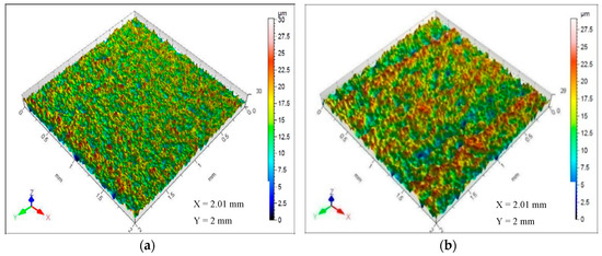 Effects of injection pressure on the surface topography: (a) S = 36 mm/min, p = 10 bar; Sa = 2.32 µm; (b) S = 36 mm/min, p = 6 bar, Sa = 3.40 µm.