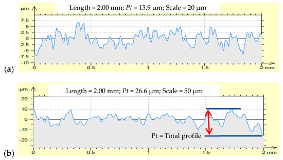 Effects of injection pressure on the profile of roughness: (a) S = 36 mm/min, p =10 bar; Ra = 1.96 µm; (b) S = 36 mm/min, p = 6 bar, Ra = 2.84 µm.