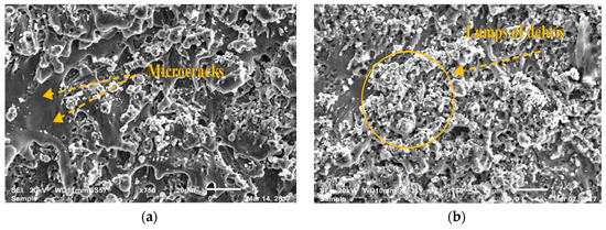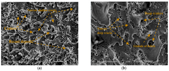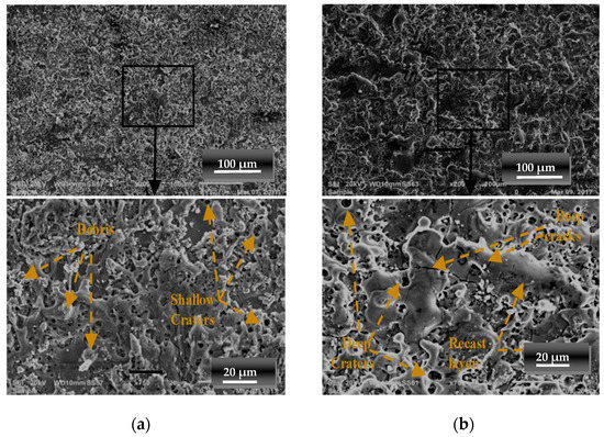 Figure 7a depicts a surface cut at a higher pressure of p = 10 bar and cutting speed at the level of S = 36 mm/min. It seems to have shallow cracks and very little debris. However, we can observe from Figure 7b the deeper craters and the larger irregularities at the surface of the specimen cut with a dielectric injection pressure of p = 6 bar and cutting speed at S = 36 mm/min.