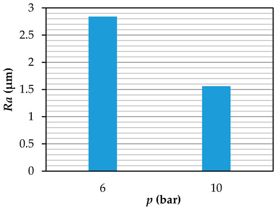 Value of surface roughness Ra at S = 36 mm/min, p = 6 bar and p = 10 bar.