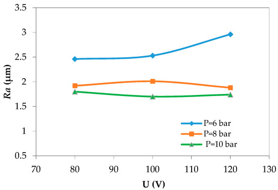 Figure 9 indicates the variation of the roughness values depending on the current voltage under the three different injection pressures. It seems that there is a significant influence of the voltage on the surface condition, especially with lower injection pressure. This relationship is related to the role of injection fluid that cools the cutting surface during the operation.