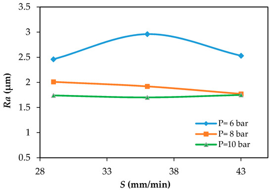 Figure 10 demonstrates the evolution of the surface roughness values, Ra, as a function of the cutting speed S. One may conclude that the S value has an unremarkable influence on the surface roughness values, Ra. By increasing the cutting speed S, the roughness value remains mostly stable for the pressure values 8 and 10 bar, whereas for a lower pressure of p = 6 bar, the surface roughness values decrease as a function of the cutting speed S (29 to 43 mm/min).