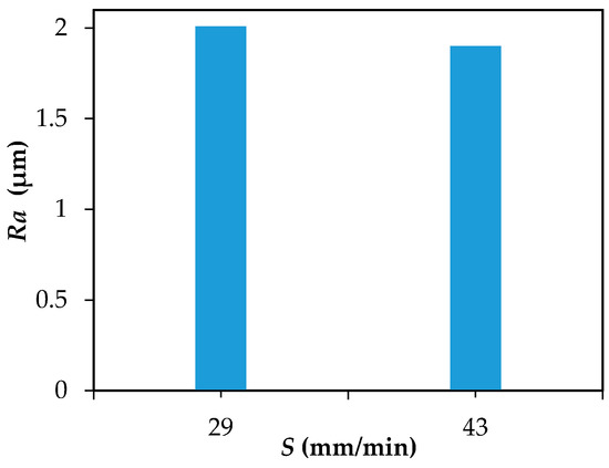 Diagram of the value of the surface roughness Ra at p = 8 bar; S = 29 mm/min and S = 43 mm/min.