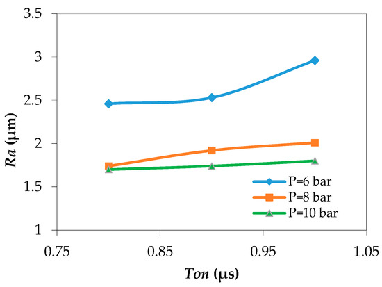 The second-order RSM model for minimizing the surface roughness value, Ra, is formulated under the following Equation (3). This equation represents the regression function for a surface roughness value Ra as a function of p, S, U, and Ton.