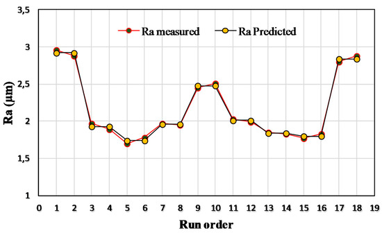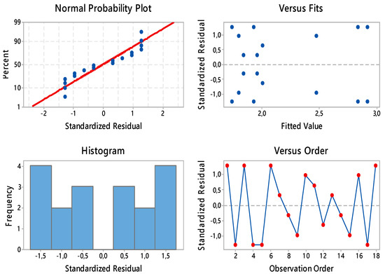 Figure 17 shows that the residuals are distributed approximately in a straight line, showing a good relationship between the experimental and predicted values for all the surface roughness Ra performances, and the variable follows the normal distribution. Therefore, the developed model is considered to be adapted to the observed values. Similarly, these figures show that the residues found are randomly dispersed but are independent.
