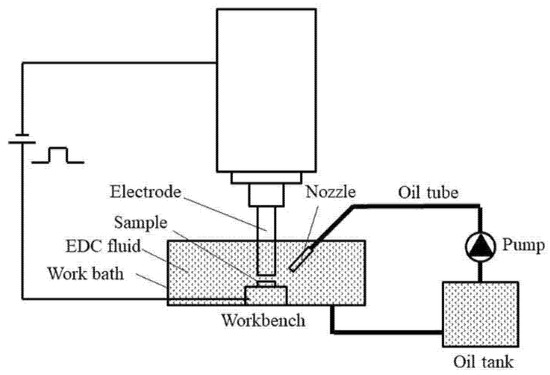 The selected substrate was low-carbon steel. The steel samples were cut to dimensions of 10 mm × 10 mm × 3 mm and sanded with grape 320 SiC paper to remove the oxidation layer from the steel surface. The structure of the EDC machine (D7145, Jiangsu Sanxing Machinery Manufacture Co., Ltd., Taizhou, China) is shown in Figure 1.