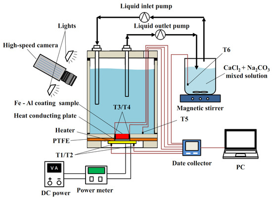 The CaCl2 + NaHCO3 mixed solution with a concentration of 0.1 mol·L−1 was used to characterize the antifouling performance of the polished and modified surfaces [1]. All chemical reagents were analytical grade, and the solvent was deionized water. The antifouling experiment was carried out on a self-made heat-transfer test device, as shown in Figure 2. All thermocouples are type K. The antifouling experiment samples, including polished surface and Fe–Al coating samples, were immersed in the fouling solution and kept in the self-made heat-transfer test device for 72 h. The input heat flux in the experiment was 98 kW·m−2 and the experiment lasted 72 h. The data collector recorded the values of all thermocouples every 5 min. During the antifouling experiment, a high-speed camera (5KF20C, FuHuang AgileDevice, Hefei, China) was employed to record the transformation procedure of the tested surface at 100 frames/s.