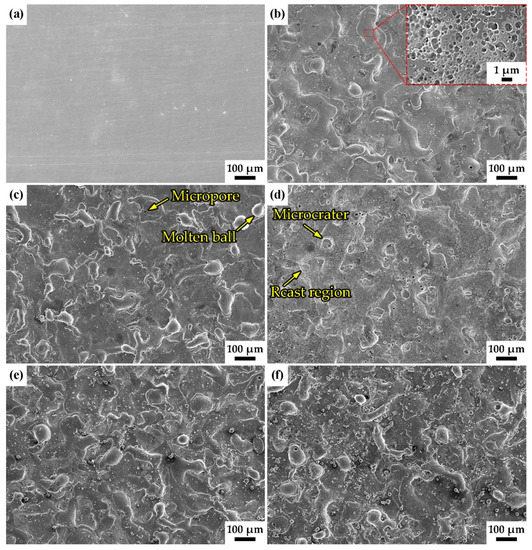 Figure 3 shows the morphology of low-carbon steel and Fe–Al coating before antifouling experiment. As shown in Figure 3a, the low-carbon steel surface is a flat surface with some scratches after polishing (PS). The Fe–Al coating samples shown in Figure 3b–f show that there are many micro–characteristics, such as micro–craters, micro–porous, molten balls, and recast regions, which are distributed homogeneously on the sample surface fabricated by EDC technology (EDCed coating). The micro-structures on the Fe–Al coating surface are typical EDM characteristics [24]. As the gap voltage increases, the number and dimension of the micro–EDM characteristics in the EDCed coatings increase, indicating that the morphology of the Fe–Al coating has become more complicated. Moreover, according to the high magnification SEM image of the Fe–Al coating sample shown as the inset in Figure 3b, there are many nanopores on the Fe–Al coating. The porosity of the Fe–Al coating was measured by Image J software (National Institutes of Health, Rockville, MD, USA), and the results are shown in Figure 4. As shown in Figure 4f, the porosity of Fe–Al coatings was reduced as the gap voltage increased from #1 to #5, and there was a sharp decrease from low gap voltage to high gap voltage.