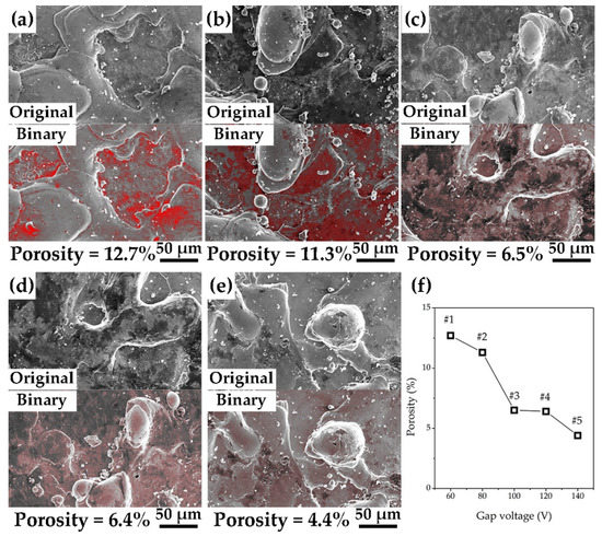 Porosity values of (a) #1, (b) #2, (c) #3, (d) #4, and (e) #5 Fe–Al coatings, and (f) porosity of Fe–Al coatings versus gap voltage.