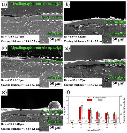 The coating thickness and roughness of Fe–Al MNS are shown in Figure 5. As shown in Figure 5a–e, the Fe–Al MNSs with different coating thicknesses are formed continuously on the substrates and no cracks appeared in the Fe–Al MNS, which indicates that Fe–Al MNS was a compact coating. According to Figure 5f, the average thickness of Fe–Al MNS decreased with the increasing gap voltage. Meanwhile, the roughness values of Fe–Al MNS samples were higher than those of PS with 0.37 ± 0.11 μm of Ra, as shown in Figure 5. The roughness values of Fe–Al MNS samples also decreased with the increase of gap voltage. The reason may be that the number of recast regions on Fe–Al MNS increased with the increasing gap voltage, which covered the coating surface to reduce the roughness.
