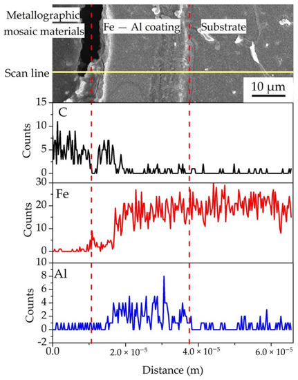 According to the line scan result of EDS from the section of Fe–Al MNS sample shown in Figure 6, the Al element only exists in the Fe–Al MNS and the Fe element exists in both the Fe–Al MNS and the substrate. The results shown in Figure 6 indicate that there is a metallurgical layer between Fe–Al MNS and the substrate, which could enhance the bonding strength between them. Moreover, C mainly exists on the surface of Fe–Al MNS and the contents in both Fe–Al MNS and substrate are low. Because the high temperature during the electrical discharge process of the Fe–Al electrode resulted in the gasification of EDM fluid, the carbon element of EDM fluid combined with the Fe and Al elements to form carbides in the coating. Thus, some carbides were formed on the surface of Fe–Al MNS, which was consistent with the results of Table 2.