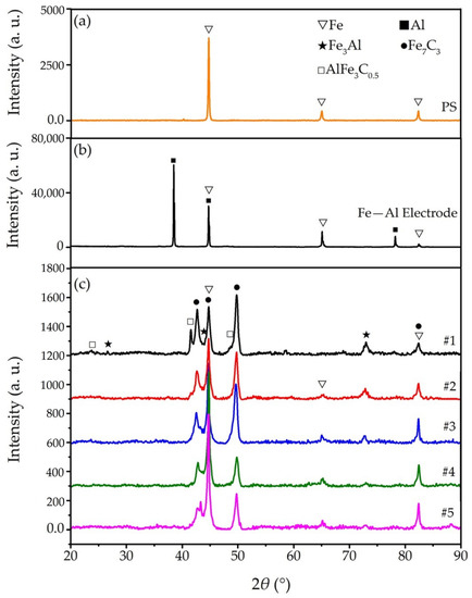 Figure 7 shows the XRD results of PS, the Fe–Al electrode and Fe–Al MNS samples. As shown in Figure 7a, there is only Fe element characteristic peaks in the XRD results. According to the XRD results of the Fe–Al electrode shown in Figure 7b, only Fe and Al phases exist, without the Fe–Al phase. The reason could be that the sintering conditions of the Fe–Al electrode described in Section 2.1 cannot achieve the formation conditions of Fe–Al composition [25,26], and the powders of Fe and Al only adhered in the Fe–Al electrode. The XRD results of Fe–Al MNS samples #1, #2, and #3 are shown in Figure 7c. According to the XRD results of Figure 7c, the characteristic peaks of Fe and Al also appeared in all Fe–Al MNS samples, and there are some typical characteristic peaks of Fe3Al phase and carbides, such as Fe7C3 and AlFe3C0.5 phases. The XRD results shown in Figure 7c indicate that the Fe3Al phase was formed in the Fe–Al MNS. Because of the high temperature and pressure during the electrical discharge process of the Fe–Al electrode [27,28], the gap between the Fe–Al electrode and working piece acted like a sintering furnace, which promoted the formation of the Fe3Al phase in the coating.