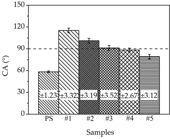 Figure 8 shows the contact angles of PS and Fe–Al MNS samples. As shown in Figure 8, the contact angle (CA) of PS is below 90°, indicating that PS is the hydrophilic surface. Although the CAs of Fe–Al MNS samples are all higher than those of PS, but CAs of #4 and #5 Fe–Al MNS are below 90°, which indicate that #4 and #5 Fe–Al MNS are also the hydrophilic surfaces. The CAs of Fe–Al MNS samples #1, #2, and #3 with low gap voltage (<100 V) are over 90°, indicating that the Fe–Al MNS samples with a low gap voltage are hydrophobic surfaces. Meanwhile, the CAs of Fe–Al MNS samples decreased with the increasing gap voltage. With the increasing gap voltage, the morphologies of Fe–Al MNS become increasingly complex, according to Figure 3b–f. A lot of micro/nanostructures on the surface were covered by the recast region, causing the surface roughness of Fe–Al MNS to decrease, as shown in Figure 5. According to the Wenzel [30] and Cassie-Baxter [31] wettability mechanism, the contact between the water droplet and the Fe–Al MNS is complex. The water droplet could infiltrate into the micro/nanostructures or be isolated by the trapped air in the micro/nanostructures. There are not enough micro-pores in the Fe–Al MNS with high gap voltage to trap the air for the isolation of water droplet, as shown in Figure 3f and Figure 4. Thus, the #5 Fe–Al MNS fabricated with a high gap voltage shows the lowest CA.