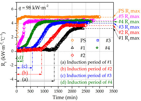 Fouling resistance Rf plots of PS and Fe–Al MNS samples with time in the heat flux of 98 kW·m−2.