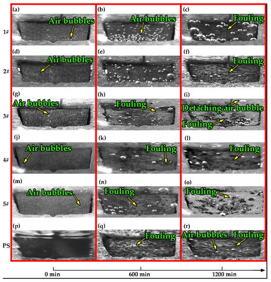 A high-speed camera was employed to capture the surface morphologies of Fe–Al MNS during the antifouling experiment, which are shown in Figure 10. As shown in Figure 10a,d,g,j,m,p, there were some air bubbles trapped on the Fe–Al MNS, and no air bubbles were trapped on the PS at 0 min. When the Fe–Al MNS sample was immersed in the fouling solution, the trapped air appeared as bubbles on the Fe–Al MNS surface [38]. Compared with Fe–Al MNS, there were no micro/nanostructures on the surface of PS to trap air, so no air bubbles appeared on the surface. Additionally, the number and dimension of air bubbles that adhered on the surface of #4 and #5 Fe–Al MNS were less than on the other Fe–Al MNS. Over time, as shown in Figure 10b,e,h,k,n,q, a growing number of air bubbles appeared on the Fe–Al MNS due to the enhancement of boiling bubble activity [39,40]. The detachment of boiling bubbles from the Fe–Al MNS helped to dislodge the loose fouling from the surface with a wiping action [32]. Thus, there was no fouling deposited on the surface of #1 and #2 and some fouling deposited on the surface of #3, #4, and #5 where there were no boiling bubbles. Compared with Fe–Al MNS, the PS was totally different, with a lot of fouling deposited, which covered the whole heat-transfer surface with a fouling layer. Because of the hydrophilic property of PS, it was convenient that the fouling crystals in the fouling solution were deposited on the surface. Furthermore, there was no wiping action on the surface of PS due to there being no detachment of boiling bubbles, resulting in the deposited fouling layer being strongly adhered on the substrate. At 1200 min, as shown in Figure 10c,f,i,l,o,r, the fouling layer adhered on the PS was still stable and fouling also appeared on all Fe–Al MNS samples. The fouling deposited on the #5 Fe–Al MNS was the greatest of all the Fe–Al MNS samples, while on the other Fe–Al MNS it was reduced gradually from #4 to #1. As shown in Figure 10c, there were a lot of large air bubbles on the #1 Fe–Al MNS, which could isolate the Fe–Al MNS from the fouling solution. In addition, the wipe action from the detachment of bubbles continued to affect the deposition of fouling. These phenomena were also observed on the other Fe–Al MNS in Figure 10f,i,l,o. However, the average dimension of detaching air bubbles was gradually decreased from #2 to #5 Fe–Al MNS. According to Figure 8, the hydrophobic property of #2, #3, #4, and #5 Fe–Al MNS was weaker than that of #1 Fe–Al MNS, resulting in the fouling crystal nucleus being able to adhere in the micro/nano pores of #2, #3, #4, and #5 Fe–Al MNS to impede the formation of boiling bubbles. Thus, the wiping action from the detachment of boiling bubbles was weakened, so fouling could be easily deposited on the #2, #3, #4, and #5 Fe–Al MNS compared with #1 Fe–Al MNS.