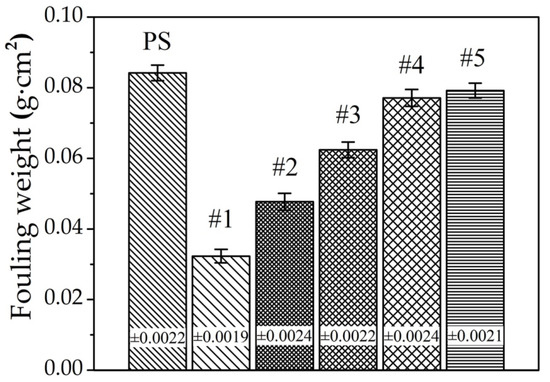 The fouling weight per area of all samples after the antifouling experiment is shown in Figure 11, indicating that the fouling deposited on the PS was the highest. Although there was fouling on the Fe–Al MNS samples, the amount was less than that on the PS and gradually increased. As shown in Figure 9, the induction periods of #1, #2, #3, and #4 Fe–Al MNS were 1350, 896, 568, and 214 min, respectively. Moreover, the Rf max of all Fe–Al MNS samples was lower than that of the PS sample. Moreover, the Rf max of #1 Fe–Al MNS was lowest in all samples and the Rf max of the other Fe–Al MNS samples were close, a situation that also can be observed for the thickness of the deposited fouling layer in Figure 10c,f,i,l,o.