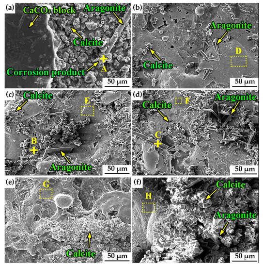 Figure 12 shows the fouling morphologies on the PS and Fe–Al MNS samples after 72-h antifouling experiments. As shown in Figure 12a, a large amount of fouling was deposited on the PS and some of the fouling crystals were large, which increased the Rf of PS to the highest value. The #1, #2, #3, #4, and #5 Fe–Al MNS samples after antifouling experiments are shown in Figure 12b–f, respectively. As shown in Figure 12b–f, there was also a lot of fouling deposited on the surface of Fe–Al MNS after the antifouling experiment. Compared with the fouling morphology on PS, the fouling crystals deposited on the Fe–Al MNS were smaller and distributed randomly. According to the EDS results of all samples after the antifouling experiment shown in Table 3 and Figure 12, the composition marked A is the corrosion product of the substrate. The compositions marked B with a cube-like shape and C with a needle-like shape show typical CaCO3 fouling [41], which also existed on the PS after the antifouling experiment showing in Figure 12a. There is no Ca element detected in the test regions without deposition of fouling crystals on the surface of Fe–Al MNS, which are marked D, E, F, G and H in Figure 12b–f. This indicates that there are no fouling crystals deposited on the whole surface of Fe–Al MNS, but there may be a passive film or oxidation film on the surface of Fe–Al MNS. In addition, the number of fouling crystals deposited on the Fe–Al MNS increased gradually from #1 to #5 shown in Figure 12b–f. The results indicate that Fe–Al MNS shows better antifouling property in this study and the antifouling property can be affected by the surface characteristics. Moreover, although there are a lot of Cl– ions in the fouling solution, which can react with the Fe element in the Fe–Al MNS, the activity of Al is so strong that a passive film forms preferentially to protect the Fe–Al MNS [25]. Thus, there is no corrosion product, so the fouling crystals are easily absorbed, as observed obviously on the surface of Fe–Al MNS.