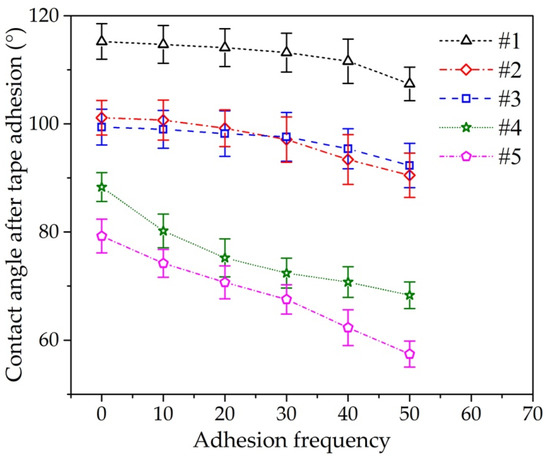 The durability is an important factor in the industrial application of Fe–Al MNS. According to the ASTM standard (ASTM D3359–17) [42], the hydrophobic property of an Fe–Al MNS sample after semi-transparent tape adhesions is measured by a contact angle measuring instrument. The tape test for the Fe–Al MNS was repeated three times per condition. The contact angle of Fe–Al MNS after the tape adhesion is shown in Figure 13. As shown in Figure 13, the contact angle values of Fe–Al MNS decreased with the increase in tape adhesion frequency, with the reduction in CA for #1, #2, #3, #4, and #5 being 6.81%, 10.51%, 7.15%, 22.64%, and 27.52%. This may be because the micro/nanostructures, such as molten balls and nanopores, are destroyed when the tape is torn off from the surface. In addition, after the durability test, Fe–Al MNS sample #1 remained in a hydrophobic surface state, which can improve the antifouling property of the surface. Fe–Al MNS samples #2 and #3 retained their hydrophobic property after 40 tests, but it was difficult for these two Fe–Al MNS samples to maintain the hydrophobic property after 50 tests. That is, the antifouling property of Fe–Al MNS is durable and there is a prospect for industrial application.