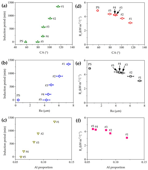 Trend plots of induction period versus (a) CA, (b) surface roughness (Ra), and (c) Al proportion. Trend plots of Rf max versus (d) CA, (e) Ra and (f) Al proportion.