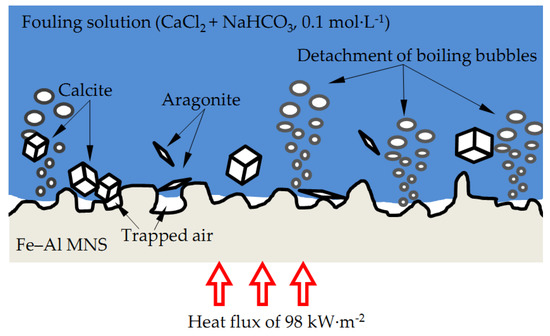 Ozden et al. [40] observed that the better the hydrophobicity of the heat-transfer surface, the lower the amount of fouling deposited on the surface. In this study, as the hydrophobicity of Fe–Al MNS reduces with the increasing gap voltage, the contact area between the fouling solution and Fe–Al MNS is increased according to the Cassie–Baxter model [31]. This means that the amount of fouling deposited on the Fe–Al MNS increased with the increasing gap voltage, and as shown in Figure 5f, the CA and Ra of Fe–Al MNS is reduced with increasing gap voltage. Therefore, the Rf max is increased with reduced CA and Ra shown in Figure 14d,e, which can also be demonstrated by the amount of fouling deposited on the Fe–Al MNS shown in Figure 10c,f,i,l,o. On the other hand, due to the slow flow rate of the test vessel, the fouling solution flowed like a laminar flow, and then the fouling crystal nucleus in the solution was deposited on the heat-transfer surface by the molecular transport mechanism, which limited the deposition rate of fouling on the Fe–Al MNS [11]. Hence, the induction period of Fe–Al MNS is extended, as shown in Figure 9. Moreover, the micro/nanostructures increased the boiling bubble activity, which creates a porous surface [41,42], and the detachment of the boiling bubble dislodged the loose fouling from the surface with wiping action [9,43]. As shown in Figure 14c,f, the Al proportion in the coating also influenced the antifouling property. A higher Al proportion can help with the formation of the passive film and effectively inhibit the diffusion of Fe2+ and Al2+ ions from the coating [44], which induce the formation and deposition of fouling in the fouling solution [45]. As described above, the co-effect among the hydrophobic property of Fe–Al MNS, the wiping action of the detachment of boiling bubbles, and the Al passive film affects the molecular transfer behavior of the fouling crystal nucleus to mitigate fouling deposition. As a result, compared with PS, the Fe–Al MNS shows superior antifouling property. Meanwhile, due to the above effects, the induction periods of different Fe–Al MNS samples are extended and different, as shown in Figure 14. The antifouling mechanism of Fe–Al MNS is shown in Figure 15.