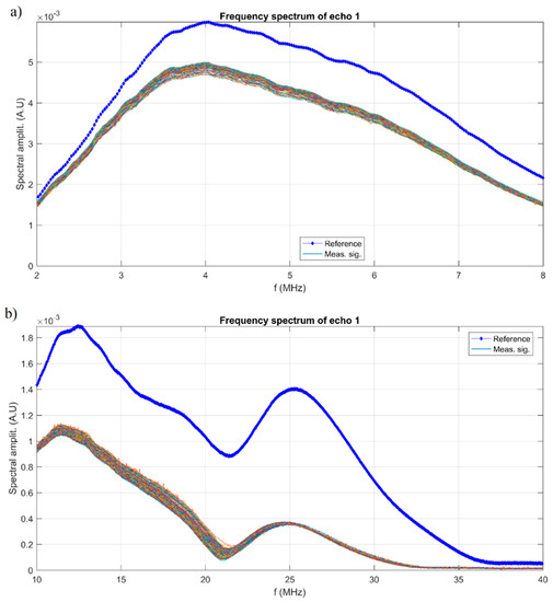 Frequency spectrum of the first transmitted echo at 5 MHz (a) and 25 MHz (b) central frequency for the AgZnHApCs suspension.