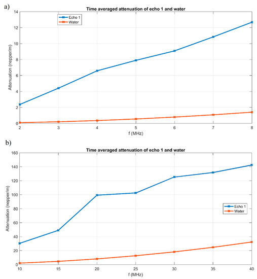 Attenuation vs. frequency for the first transmitted echo at 5 MHz (a) and 25 MHz (b) central frequency for the AgZnHApCs suspension.