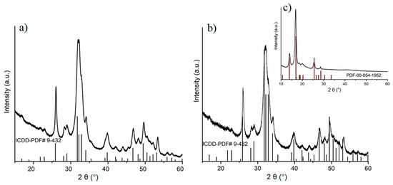 The XRD patterns of AgZnHApCs powder (Figure 3a) and coatings (Figure 3b) revealed the main diffraction peaks identified at different 2θ values that were assigned to the position of the planes of pure hexagonal HAp at (002), (211), (112), (300), (202), (310), (222), (213), (004), (323), in agreement with JCPDScardNo.09-0432 [36]. In order to calculate the average size all, the peaks of the XRD pattern were taken into account. The mean crystallite size was calculated using Scherrer’s formula