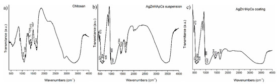 FTIR analysis revealed the presence of chitosan on the AgZnHApCs suspension and coating. FTIR spectra of AgZnHApCs suspension, AgZnHApCs coating and Cs recorded over the range of 400–4000 cm−1 were presented in Figure 4. The spectra of AgZnHApCs suspension and AgZnHApCs coating exhibit characteristic vibrational modes of HAp and chitosan, proving that the AgZnHAp nanoparticles were successfully coated with chitosan. The two samples spectra (AgZnHApCs suspension and AgZnHApCs coating) showed specific phosphate vibrational modes (ν4) at 571, 604 and 636 cm−1. The peaks at 571 and 604 cm−1 correspond to a triply degenerated bending mode of the O–P–O band [34]. The peak at 636 cm−1 was also assigned to the hydroxyl group deformation mode [36]. According to previous studies [36,37], the peak at 632 cm−1 is considered to be overlapped with an asymmetric P–O stretching vibration of PO43−. The bands at around 1088 and 1047 cm−1 in the region 900-1200 cm−1 were attributed to the C–O–P stretching and phosphorylated hydroxyl group, while the peaks at around 473 and 998 cm−1 may be assigned for P–OH groups. The bands assigned to P–O, P=O stretching of phosphate group can be observed at around 1100 to 1250 cm−1 in the region 900–1200 cm−1. According to previous studies on the interactions of calcium phosphates with chitosan [38,39], the peaks in the region 1300–1450 cm−1 can be attributed to a combination of CN–NH, CH2–OH and CH3 bands. The band from 1422 cm−1 can be assigned to the bending CH vibrations, while the peak from 1076 cm−1 in the region 1008–1150 cm−1 can be assigned to groups C–O–C. The absorption bands at 1315, 1372 and 1407 cm−1 were assigned to the carbonate bands of acetic acid which were not observed in the spectra. On the other hand, the presence of carbonate bands of acetic acid should be avoided for biocompatible applications [38,39]. The peak at 1642 cm−1 can be assigned to the N–H from chitosan. The AgZnHApCs in suspension and AgZnHAp coating showed typical bands characteristic to HAp and chitosan, as can be exhibited in Figure 4b,c.