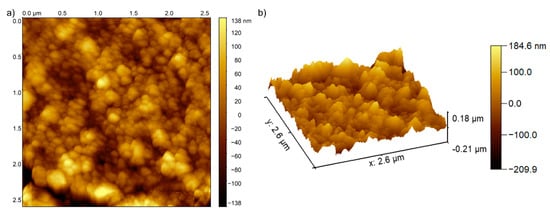 Furthermore, the surface morphology of the coatings was investigated by atomic force microscopy (AFM) with the aid of an NT-MDT NTEGRA Probe Nano Laboratory instrument (NT-MDT, Moscow, Russia), as previously reported in [31]. The data analysis of the 2D surface topographies, as well as the 3D representation of the AFM images, were performed with the aid of Gwyddion 2.55 software [32]