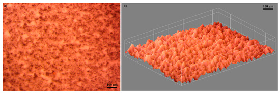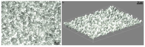 Moreover, the surface morphology of the AgZnHApCs coating was also studied by optical and metallographic microscopy. The 2D images with the optical and metallographic microscope were acquired using the 10× objective. The results are presented in Figure 6a and Figure 7a. The optical images of the surface of the AgZnHApCs coating emphasized that the coatings deposited on glass substrate are homogenous and uniform, having no visible discontinuities, fissures or irregularities. In addition, the 3D representation of the optical image of AgZnHApCs coating’s surface obtained using ImageJ software [32] is depicted in Figure 6b.