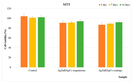 The in vitro biocompatibility of the AgZnHApCs suspensions and coatings was assessed using human fetal osteoblasts (hFOB 1.19) cells. For this purpose, the suspension and coatings were incubated with the hFOB 1.19 cell suspension for different time intervals (1, 7 and 14 days) and their viability was measured by MTT assay. The MTT results of the hFOB 1.19 cell viability are depicted in Figure 8. The experiments were repeated four times and the data were presented as mean ± SD. Furthermore, a t-test: paired two sample for means was used to perform the statistical analysis, and all the p calculated values were p < 0.05. The results revealed that both investigated samples presented a cell viability above 85% for all tested time intervals. Moreover, the results also highlighted that there was no significant difference between the samples in the form of suspension and coatings. However, a slight increase in cell viability was observed in the case of AgZnHApCs suspensions compared to the AgZnHApCs coatings for all incubation periods. Moreover, the data also suggested that the cell viability increased with the increase of the incubation time. The results showed that both samples present very good biocompatible and bioactive properties. The results are in agreement with previous studies performed to date, regarding the hydroxyapatite properties of facilitating the attachment and growth of osteoblast cells due to its high hydrophilic property [40,41].