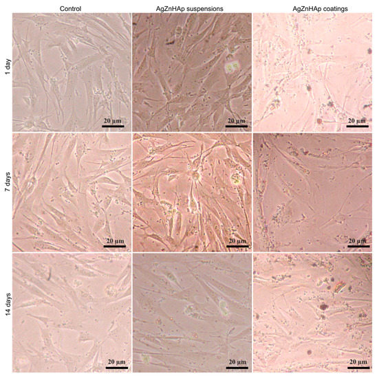 The morphology of the hFOB 1.19 cells incubated for 1, 7 and 14 days with the AgZnHApCs suspensions and coatings was also assessed using an inverted microscope. The morphology of the hFOB 1.19 cells treated with AgZnHApCs suspensions and coatings after 1, 7 and 14 days of incubation are depicted in Figure 9. The images of the hFOB 1.19 cells incubated with AgZnHApCs suspensions and coatings at different time intervals show the normal morphology of the hFOB 1.19 cells and revealed that the suspensions and coatings did not induce any significant changes in the hFOB 1.19 cells. These results are in agreement with the results of the quantitative MTT in vitro assay, and highlighted that both AgZnHApCs suspensions and coatings have a good biocompatibility and are suitable for being used in biomedical applications.