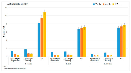 The antimicrobial activities of the AgZnHApCs suspensions and coatings were also assessed using reference gram positive, gram negative and fungal microbial strains. The antimicrobial properties of AgZnHApCs suspensions and coatings were assessed at three different time intervals of incubation (24, 48 and 72 h) against S. aureus ATCC 25923, E. coli ATCC 25922, and C. albicans ATCC 9002, by assessing the colony forming units (CFU) inhibition for each tested microbial strain. The results of the antimicrobial assay are presented in Figure 10. The antimicrobial assays were repeated four times and the data were represented as mean ± SD. A free microbial suspension was also assessed and used as positive control (C+) for all tested time intervals. The statistical analysis was done using the ANOVA single factor algorithm and the calculated p-values were less than 0.0001 [42,43]. The data revealed that the AgZnHApCs suspensions and coatings exhibited strong antimicrobial activity against all the tested strains, even after 24 h of incubation. The CFU values were significantly reduced after 24 h of incubation with the suspensions and coatings. The results of the antimicrobial assays also suggested that the CFU inhibition was significant for all tested samples and that was correlated with the incubation time. Moreover, the results revealed that the antimicrobial activity of the suspensions was greater than that of the coatings for all tested microbial strains at all tested time intervals. In addition, a fungicidal effect was noticed in the case of AgZnHApCs suspensions after 48 h and 72 h of exposure, and in the case of AgZnHApCs coatings after 72 h of incubation. The results revealed by the antimicrobial assays are in agreement with previously reported data from the literature regarding the antimicrobial properties of silver and zinc ions [5,6,7,8,44,45,46,47,48,49,50,51,52,53]. Moreover, the results are in accordance with literature data reported on the potential antimicrobial properties of materials and composite layers based on hydroxyapatite enhanced with metal ions in polymeric matrix which possess antimicrobial activity. Furthermore, the statistical analysis emphasized that the data supports that both AgZnHApCs suspensions and coatings present antimicrobial activities on the tested microbial strains and that the AgZnHApCs suspensions exhibited a greater antimicrobial activity than AgZnHApCs coatings.
