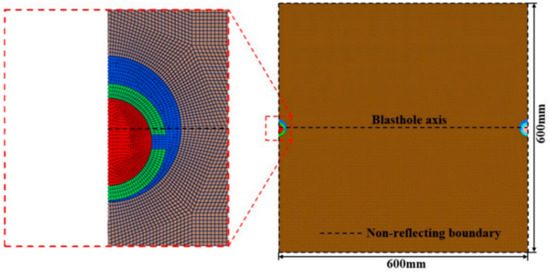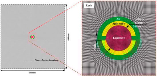 The eccentric and uncoupled numerical model of the cutting seam cartridge consists of four parts: explosive, cutting seam pipe, rock, and air. Among them, explosives and air use multi-material ALE algorithm to avoid solving anomalies caused by large deformations, and Lagrange elements are used for rocks and cutting seam pipe. A penalty function-based fluid-solid coupling constraint is set between the fluid substance and the Lagrange element to transfer the blasting load to the cutting seam pipe and the rock. The CONTACT_AUTOMATIC_SURFACE_TO_SURFACE contact is set between the cutting seam pipe and the blasthole wall to realize energy transfer. To reduce the amount of numerical calculation, an element length is adopted in the thickness direction, and a displacement constraint is imposed. Since the end effect of the explosive volume is not considered, the three-dimensional problem can be converted into a two-dimensional problem for research, that is, a quasi-two-dimensional calculation model is used for simulation. The finite element model is shown in Figure 1. The model has a total of 623,536 elements. The model measuring is 600 mm × 600 mm × 1 mm. The blasthole diameter is 40 mm, the explosive diameter is 24 mm, and the uncoupled coefficient between the explosive and the blasthole is 1.67 [35]. The inner wall of the cutting seam pipe is close to the explosive, the thickness is 4 mm, and the cutting seam width is 4 mm [36,37,38]. Because the experimental model is small, in order to simulate the actual infinite rock mass, transmission conditions are imposed on the model boundary, and the boundary is set as a non-reflective boundary.
