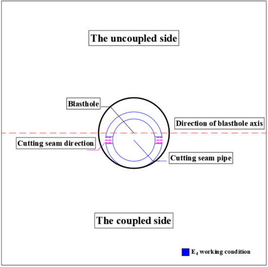 where E is the eccentric uncoupled coefficient, is the radius of the blasthole, is the radius of the cutting seam pipe, and is the distance from the center of the cartridge to the center of the blasthole. When the eccentric uncoupled coefficient is 0, the cartridge coincides with the center of the blasthole. When the eccentric uncoupled coefficient is 1, the coupled side cutting seam pipe is close to the blasthole wall.