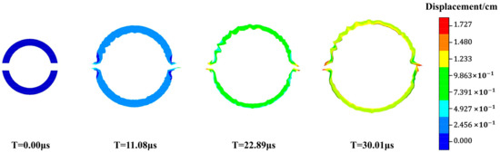 At t = 22.89 μs, the cutting seam pipe expands continuously and comes into contact with the blasthole wall, and the shock wave spreads outward in the form of a circular surface wave. When t = 24.34 μs, the cutting seam pipe loses its wrapping property to the detonation product. It’s known from the pressure cloud diagram that the detonation product is released gradually with the expansion of the cutting seam pipe when the cutting seam cartridge explodes. Figure 4 is a timing diagram of the cutting seam pipe being expanded and gradually destroyed by the impact of detonation products. Due to the existence of the cutting seam pipe, the stress is concentrated at the cutting seam direction, which enhances the guiding effect of the initial crack and cushions the stress at the non-cutting seam direction. Therefore, in directional blasting, the cutting seam between adjacent blast holes are arranged along the axis of the blast hole to achieve the effect of directional blasting.